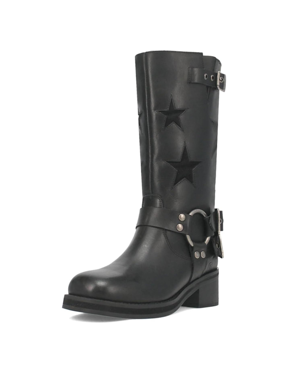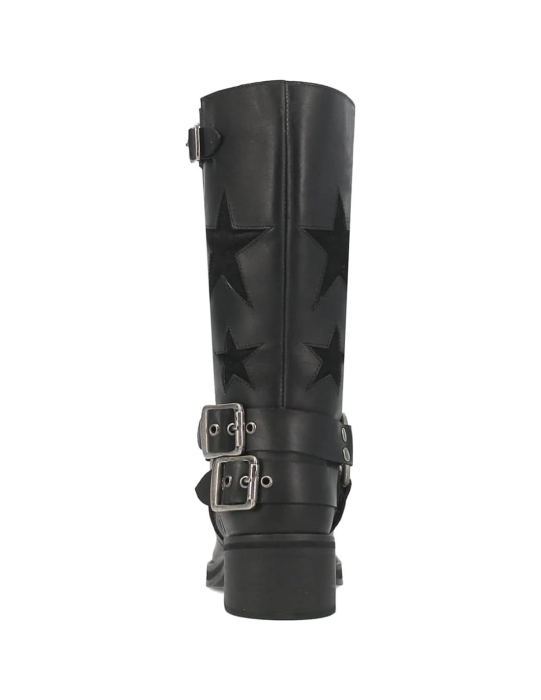 - CLÁSICO Y ESTILOSO: Con incrustaciones de estrellas, detalles de arnés rebelde y correas dobles ajustables que capturan la atención, las botas hasta la pantorrilla para mujeres tienen una estética de motociclista.