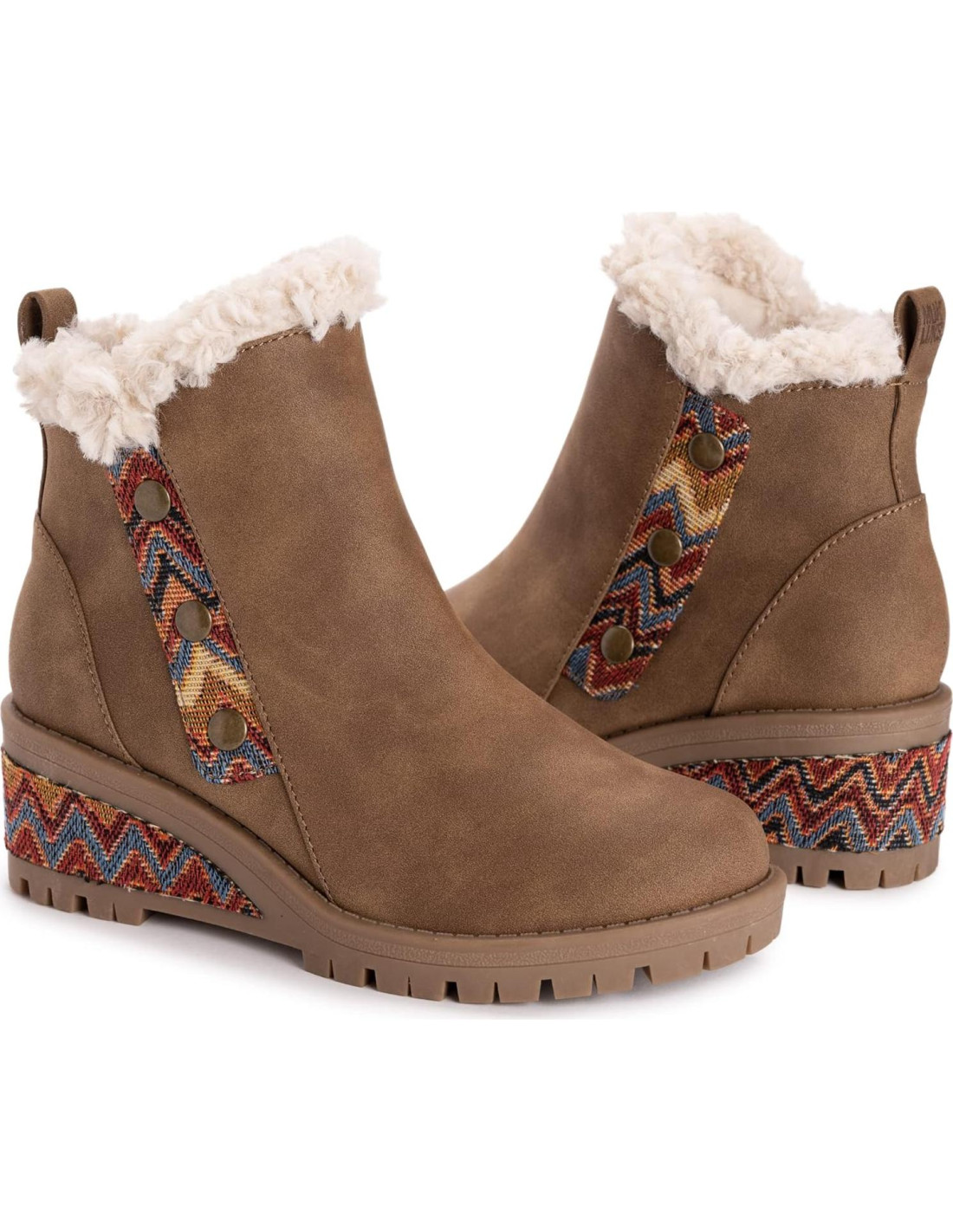 Mantente a la moda mientras te expresas con las Botas de Cuña Halden de Noruega para Mujeres MUK LUKS. Suave piel sintética te mantendrá abrigada mientras los patrones de acento de tendencia detallados seguramente añadirán ese toque especial que buscas para esta temporada de otoño. Limpia con un paño húmedo. No blanquear. Dejar secar en plano. Importado. - Suela TPR duradera - 85% poliuretano, 15% poliéster en la parte superior - Forro 100% poliéster - Plantilla 100% poliéster - Plantilla de espuma viscoelástica - Tacón de cuña - Solapa con patrón de botones - Múltiples opciones de color - Tallas enteras y medias para mujeres de EE. UU. 6-11