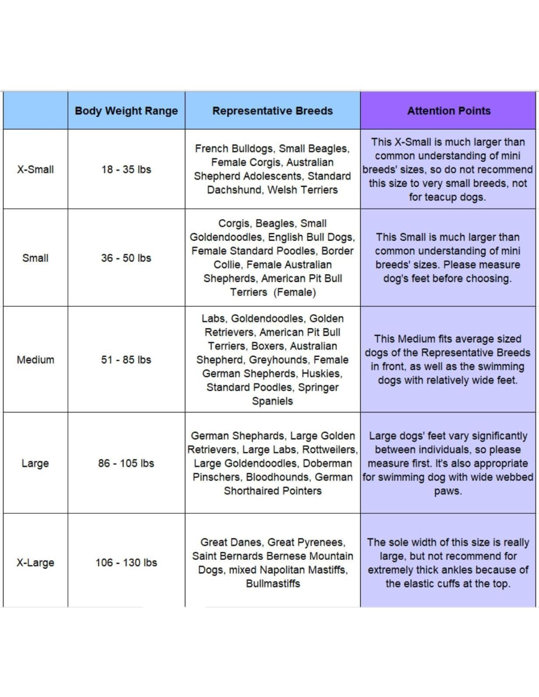 - Por favor, mide las patas de tu perro primero antes de elegir el tamaño, y tamaño X-Large: Longitud de la Suela Interior 9.5 cm, Ancho de la Suela Interior 8 cm; Si la medida cae entre dos tamaños, opta por el tamaño más pequeño para asegurar un ajuste ceñido