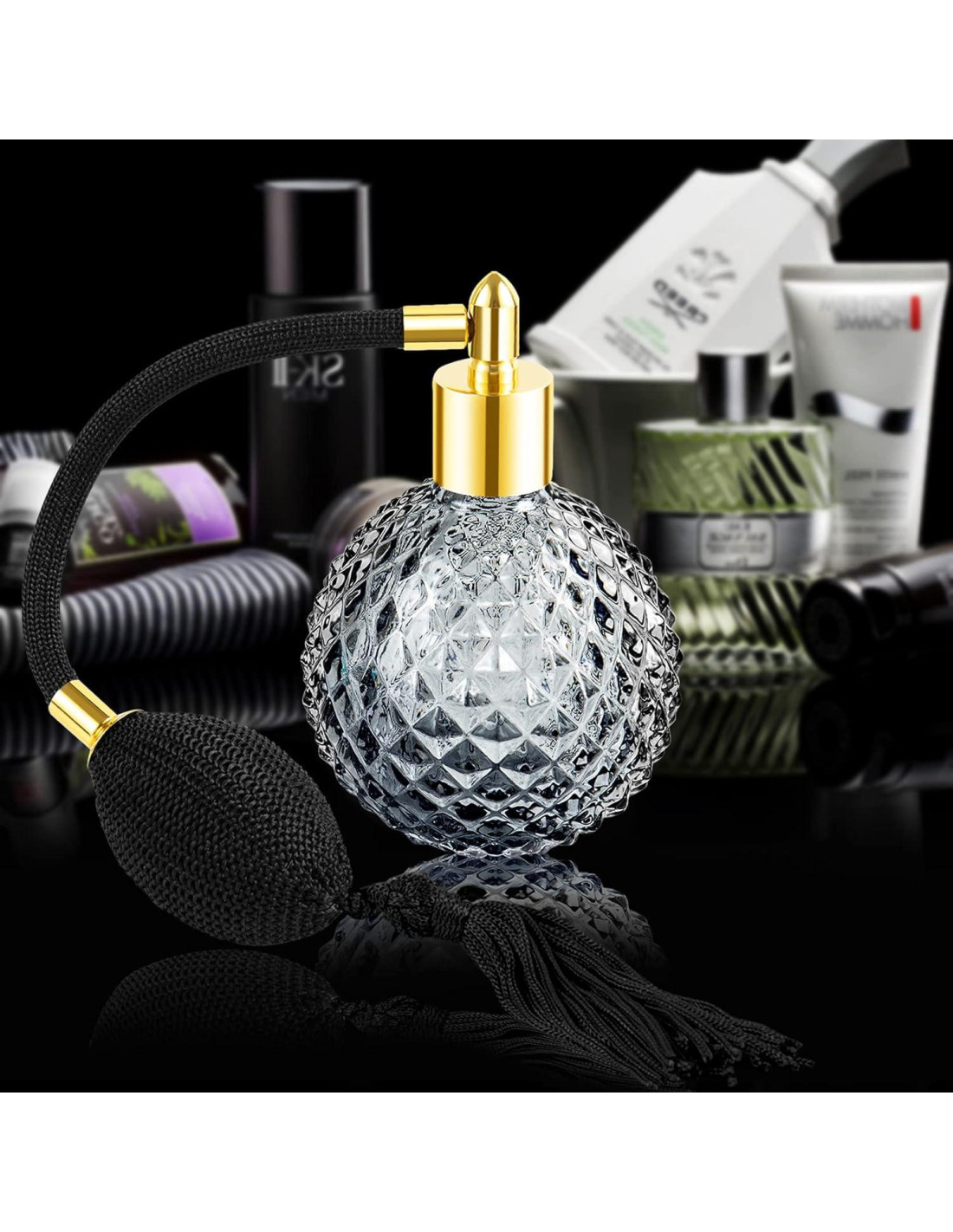 - Botella de perfume negra hecha de material de vidrio cristalino, con borla larga, patrón de piña muy hermoso.