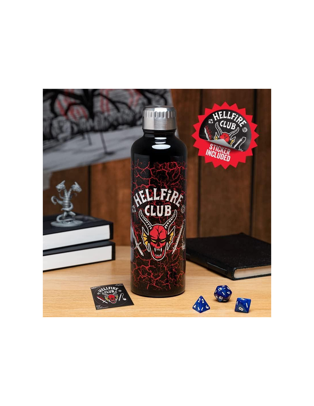 - Entra en el Mundo del Revés: Todos los cazadores de Demogorgon, añade esta botella de agua de acero inoxidable negra de 500ml (16 fl oz) que presenta el logo del Club Hellfire de Hawkins de la serie original de Netflix, a tu inventario de jugador.