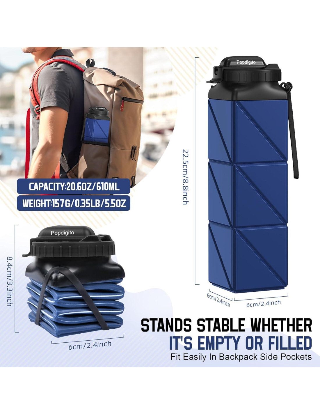 - 2. Diseño Plegable y que Ahorra Espacio Estas botellas de agua de silicona están diseñadas para plegarse a un tamaño compacto, lo que las hace perfectas para ahorrar espacio en tu bolsa o mochila. Ya sea que estés viajando, yendo al gimnasio, haciendo senderismo, acampando o en la oficina, se expanden para contener hasta 20.6oz (610 ml) de líquido cuando están llenas.