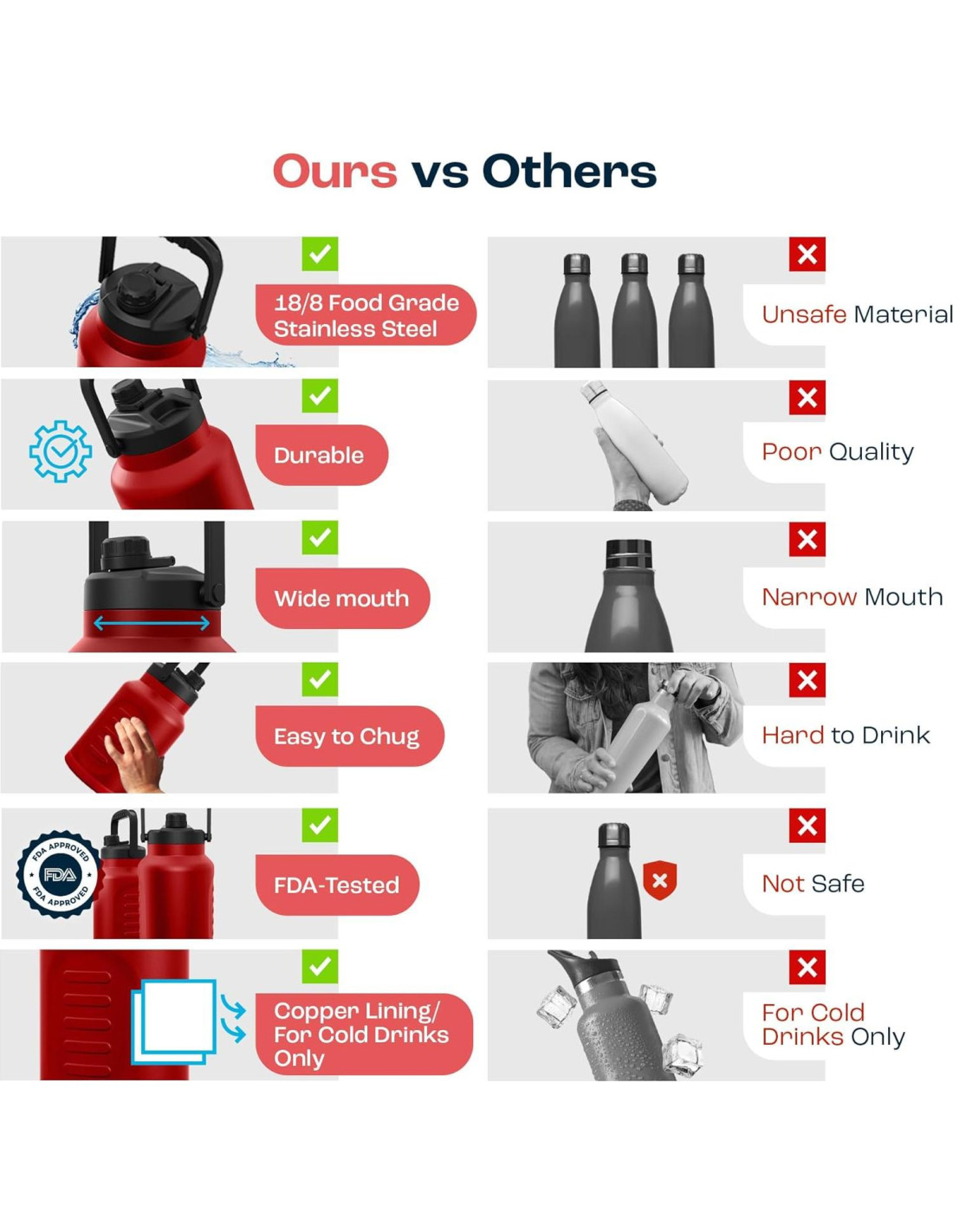 - Innovación de Placa de Cobre al Vacío - Experimenta un control de temperatura de primera con la placa de cobre al vacío de nuestra botella de agua de un galón. Creada a partir de acero inoxidable 18/8, esta gran jarra de agua de galón tiene un interior revestido de cobre, entregando bebidas frías o calientes.