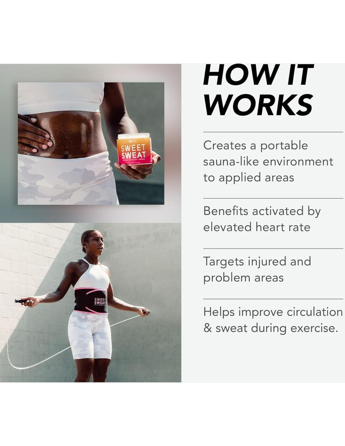 - APLICACIÓN: Antes de hacer ejercicio, aplica una cantidad generosa en la piel, cubriendo todas las áreas deseadas. Sweet Sweat se activa con tu frecuencia cardíaca elevada y es mejor usarlo durante entrenamientos de cardio. Nuestro gel Sweet Sweat se puede usar para enfocar tu abdomen, sección media, brazos, piernas o cualquier otra parte de tu cuerpo.