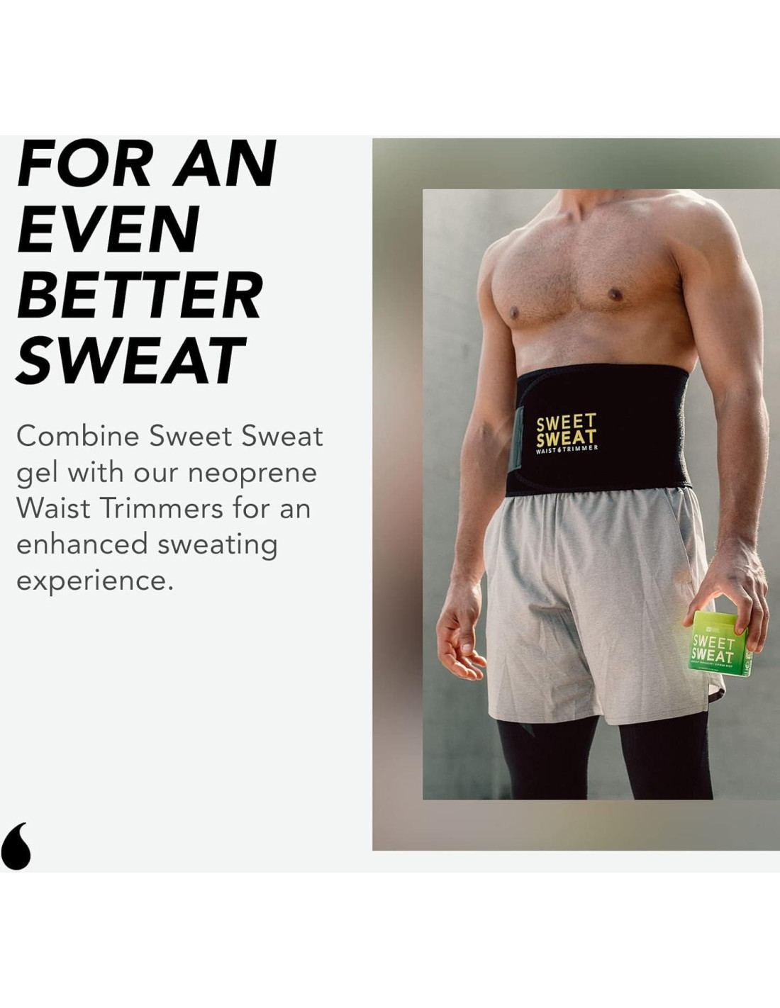 - NO OLVIDES EL RECORTADOR: Aunque nuestro gel potenciador Sweet Sweat es excelente por sí solo, recomendamos encarecidamente combinarlo con nuestro recortador de cintura para obtener lo máximo de tu entrenamiento. Simplemente combina nuestro potenciador de sudor de entrenamiento con nuestro recortador de cintura de neopreno para un goteo superior post-ejercicio que te ayude a eliminar el exceso de peso de agua alrededor del abdomen.