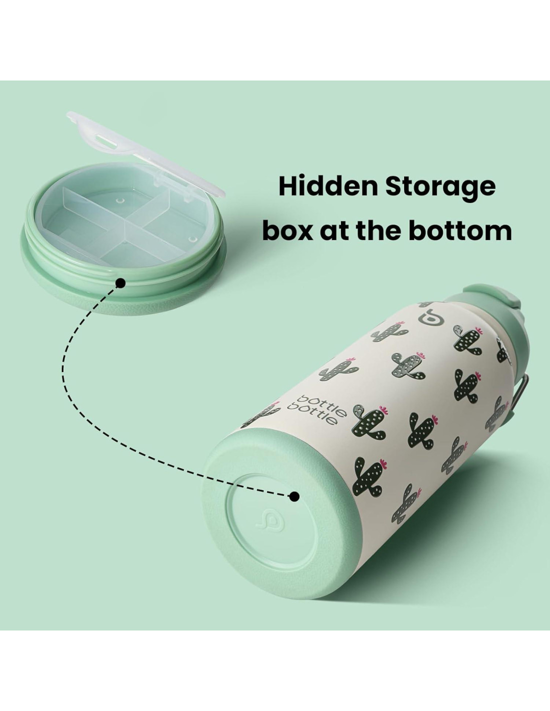 - [Con Caja de Pastillas]: Como una botella de agua con almacenamiento de pastillas, tiene un espacio de almacenamiento en la parte inferior que se puede abrir girando. Puedes usar este espacio para almacenar pastillas y vitaminas, incluso monedas y llaves, es adecuada como botella de agua deportiva