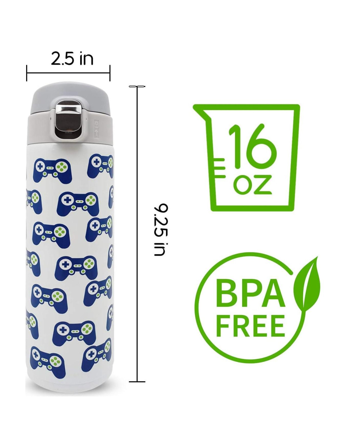- DISEÑO SIMPLE: ¡Sin popotes que limpiar ni diferentes piezas que rastrear! Solo una tapa y el recipiente principal. A los niños y niñas les encanta el diseño simple pero moderno del controlador. La botella de agua aislada es de color blanco perla con controladores de videojuegos en azul y verde. La tapa y el interior son de color gris claro con un botón de acero inoxidable. Bellamente elaborada.
