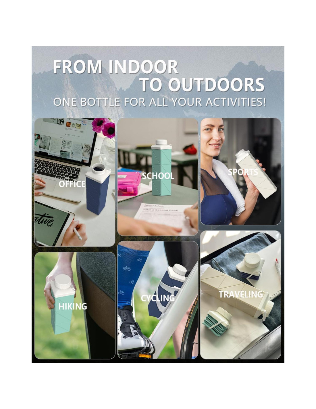 - VERSÁTIL PARA CADA ACTIVIDAD: Ya sea que estés en la oficina, el gimnasio o en clase, o disfrutando de aventuras al aire libre como senderismo, ciclismo, acampada o viajes, nuestra botella de agua plegable es un compañero conveniente para la hidratación en cualquier lugar.