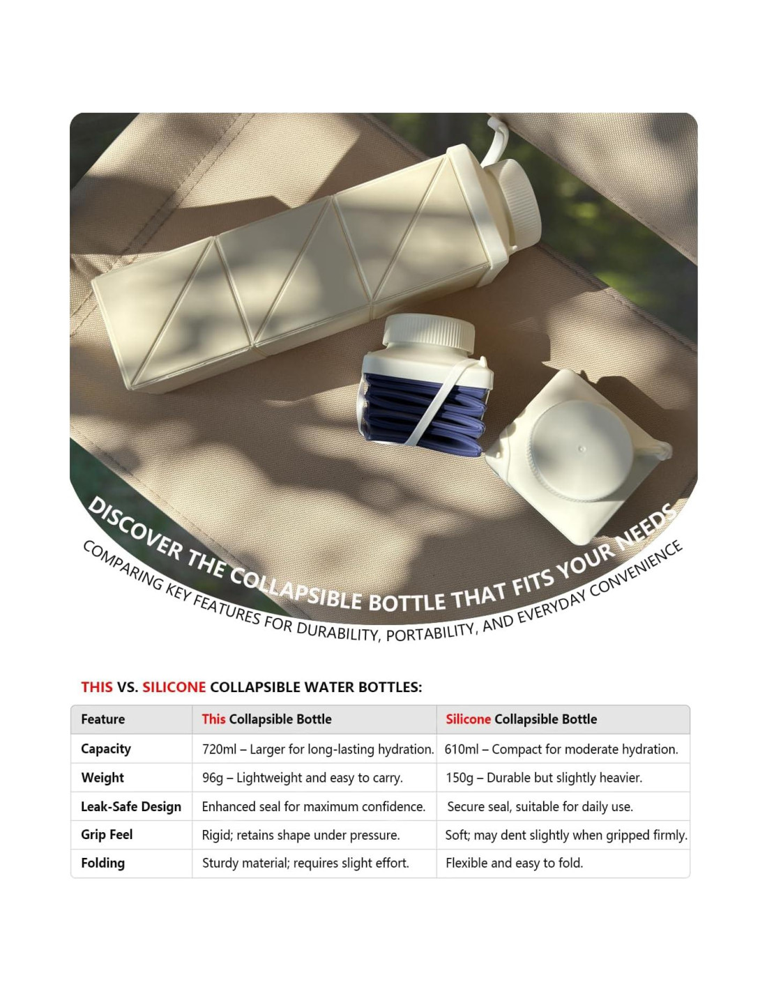 - DISEÑO DE BOTELLA DE AGUA PLEGABLE Y COMPACTA: Se expande a 24.3oz (720ml) y se pliega a aproximadamente 2/7 de su tamaño, ahorrando espacio valioso en tu bolsa o mochila, perfecto para hidratación sobre la marcha sin el volumen.