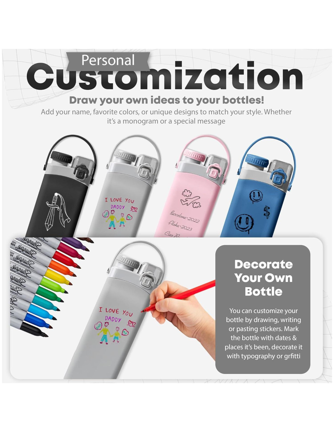 - Personalización Divertida y Creativa: El material de silicona permite una fácil personalización con marcadores, ¡haciendo que tu botella de agua sea única! Sé creativo y añade un toque personal para más diversión.