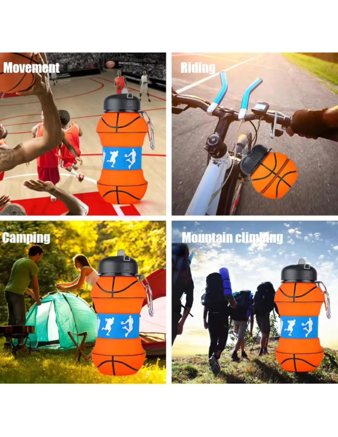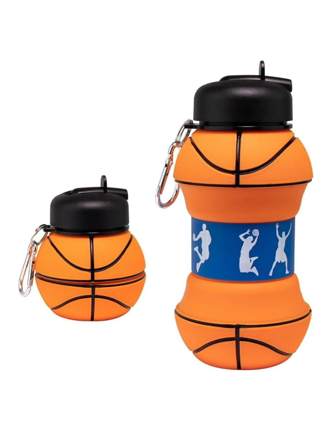 - Diseño Colapsable - Cuando está extendida, cada extremo de la botella de agua se parece a la mitad de un baloncesto, y cuando está completamente colapsada, la botella toma la forma de un baloncesto redondo