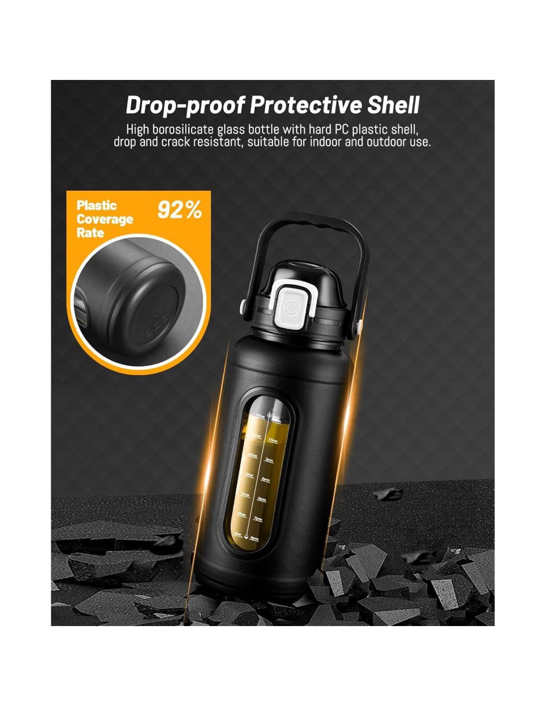- BOTELLA DE AGUA DE VIDRIO IRROMPIBLE: La funda protectora de alta resistencia está hecha de PC duro irrompible que proporciona una fuerte protección para la botella de agua de vidrio de borosilicato. Tiene un mejor efecto de protección que la funda convencional de neopreno o silicona. Ya no tendrás miedo de caídas y golpes. La superficie mate de la funda protectora externa te permite agarrarla fácilmente y reduce el sudor o la condensación.