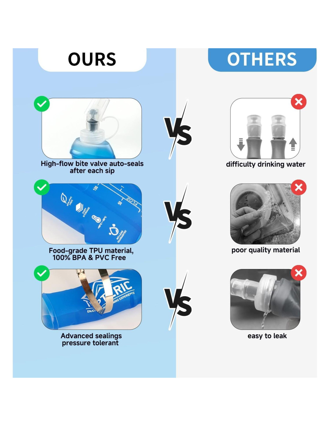 - Libre de BPA y PVC: La botella de agua suave está hecha de material TPU de grado alimenticio, 100% libre de BPA y PVC, duradero. En TOPTERIC, la reutilización es muy importante para nosotros, y nuestra bolsa de agua no es una excepción. Disfruta de un uso ilimitado de nuestra botella de agua suave portátil.