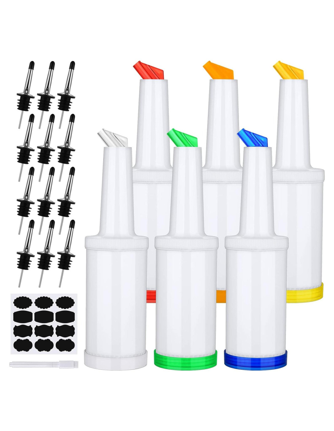 - Botellas multicolores: estas botellas para verter están diseñadas en 6 colores, incluyendo amarillo, verde, azul, blanco, rojo, naranja, lo que te permite determinar el tipo de bebidas y licores por el color; además, los colores vivos pueden brindarte una mejor experiencia visual y de uso; las exquisitas etiquetas proporcionadas en el paquete también pueden ayudarte a hacer una clasificación rápida