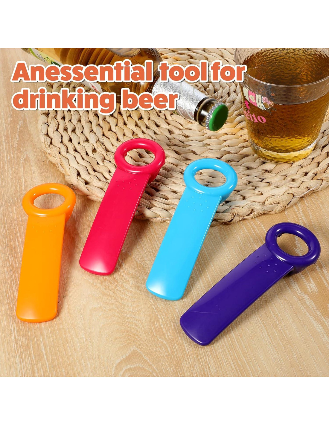Lista de empaque: 4pcs abrebotellas (1 rosa rojo + 1 azul oscuro + 1 naranja + 1 azul claro) Material: ABS Color: rosa rojo + azul oscuro + naranja + azul claro Peso (g): 137 Tamaño del producto (cm): 13.8*4.9cm/5.43*1.93in; diámetro del agujero interior: 2.9cm/1.4in, altura 2.56cm/1in