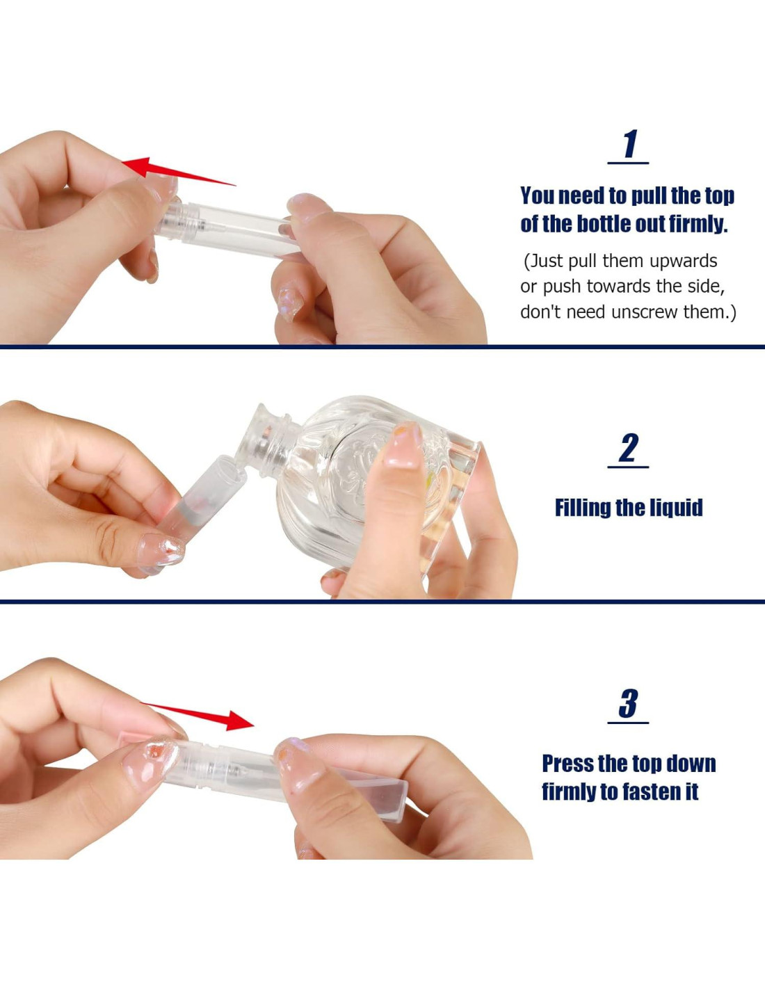 - Paquete Incluido: 10pcs 5ml (0.16oz) botellas de spray plástico claras vacías. Nota: Para abrir la parte superior de la botella, solo tira hacia arriba o empuja hacia un lado y luego se despegarán. No es necesario desenroscarlas.
