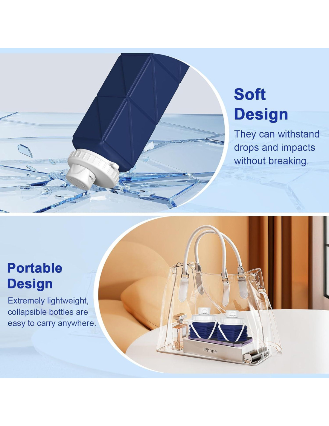 - 1. Diseño Plegable y Ahorra Espacio Estas botellas de agua plegables de 20.7oz están diseñadas para doblarse a un tamaño compacto cuando no están en uso, lo que las hace ideales para ahorrar espacio en tu bolsa. Perfectas para viajes, camping, senderismo y otras actividades al aire libre, se expanden para proporcionar plena capacidad de hidratación cuando es necesario.