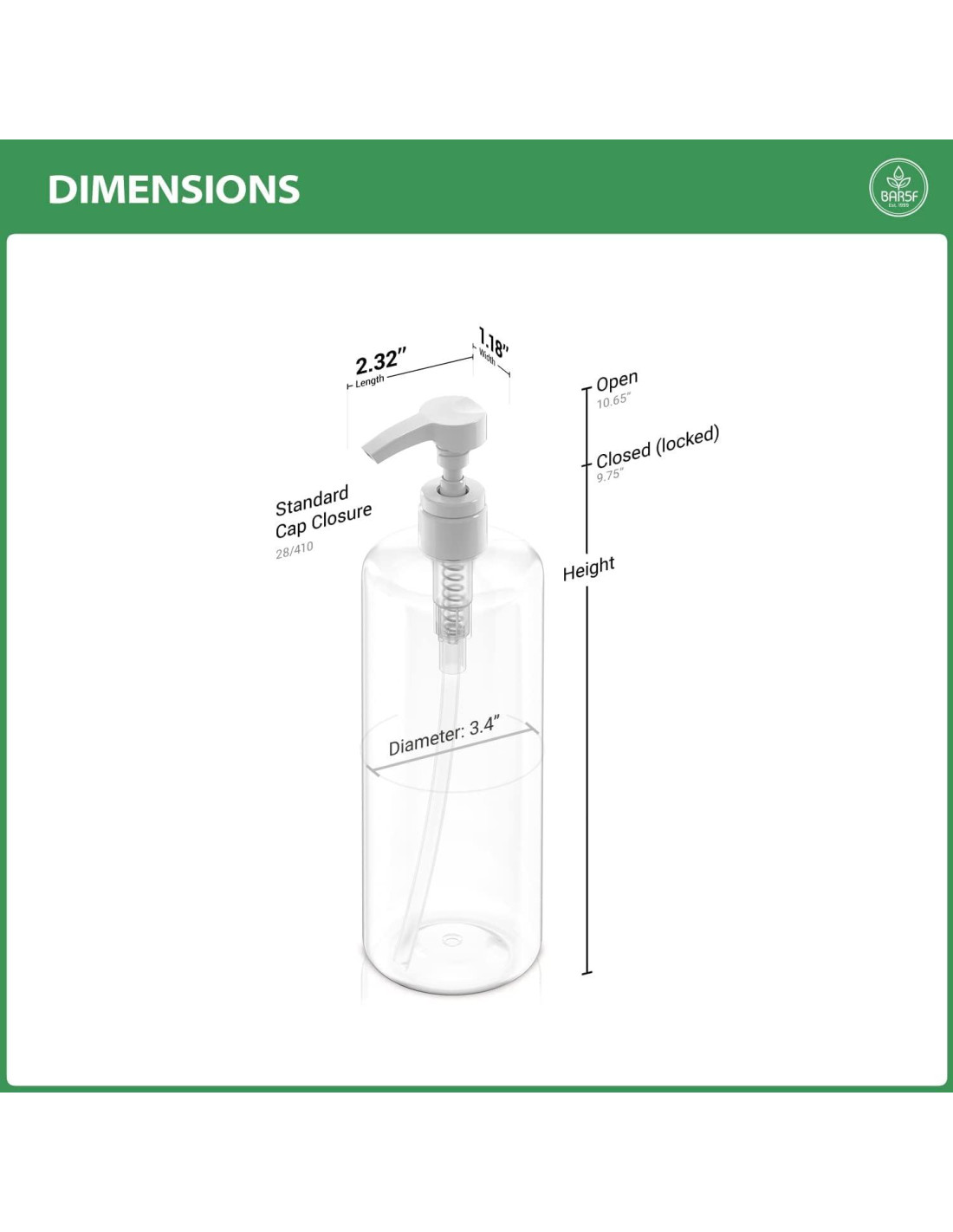 Nuestras botellas de bomba de plástico cristal claro de gran tamaño y alta resistencia no solo son atractivas en su hogar, baño o ducha, sino que son excelentes para rellenar a partir de esos productos profesionales de gran tamaño que son pesados y torpes de manejar. La acción de bombeo suave y fácil con una sola mano es esencial para esas condiciones resbaladizas en la ducha donde dejar caer o romper productos capilares costosos no es una opción. Ampliamente utilizadas para líquidos de salud y cuidado personal como champú, acondicionador, gel, lavado de manos y cuerpo, detergentes para ropa, jabones y lociones, enjuague bucal, etc. Estas botellas miden 10 pulgadas (25,4 cm) de alto con las bombas en la posición cerrada y 10.75 pulgadas (27,31 cm) con las bombas en la posición abierta, con un ancho de 4 pulgadas (10,16 cm) y una profundidad de 2.4 pulgadas (6,1 cm).