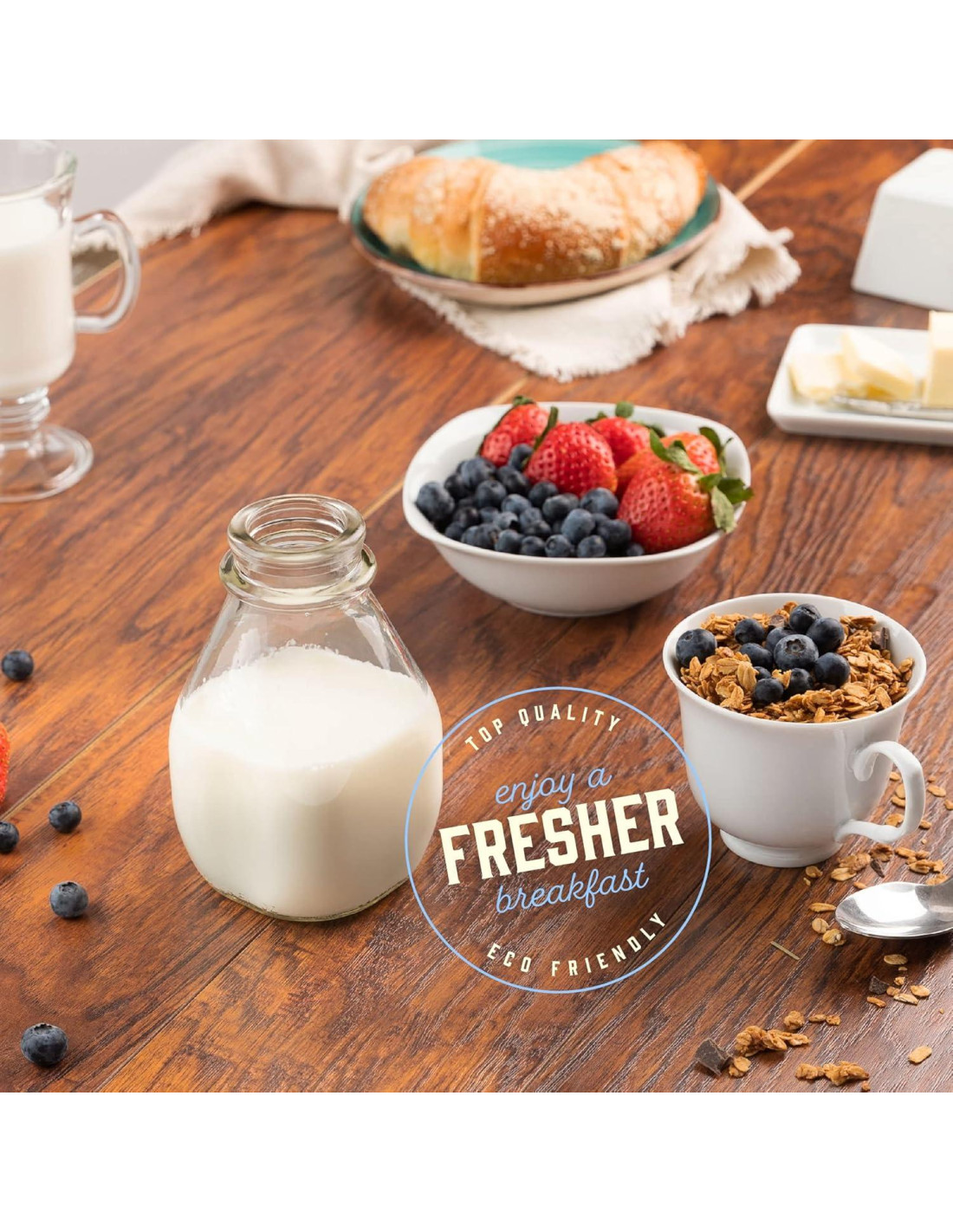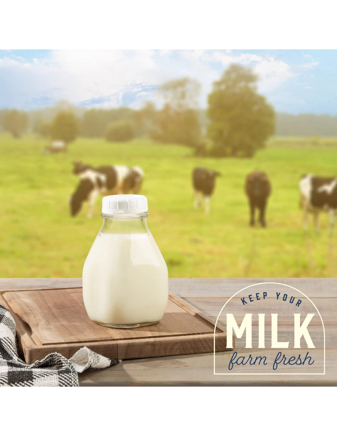 - PERFECTA PARA ALMACENAMIENTO EN REFRIGERADOR: Esta compacta botella de leche de vidrio con tapa se ajusta perfectamente en la puerta o estante de tu refrigerador. Ideal para mantener la crema, mitad y mitad, o leche fresca y fácil de verter.