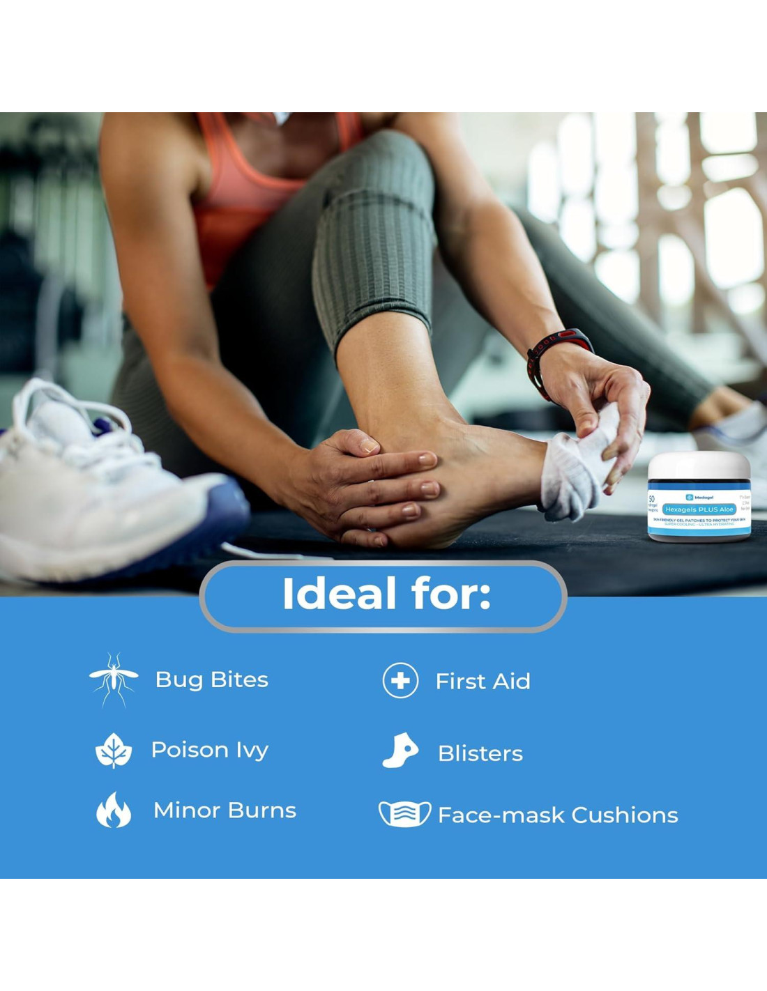 - ALIVIO CALMANTE INSTANTÁNEO: Medagel Hexagels Plus Aloe Vera proporciona un enfriamiento ultra-suave para picaduras de insectos, quemaduras menores, puntos calientes, ampollas, hiedra venenosa, irritaciones y callos, ofreciendo alivio inmediato y amortiguando la incomodidad al contacto