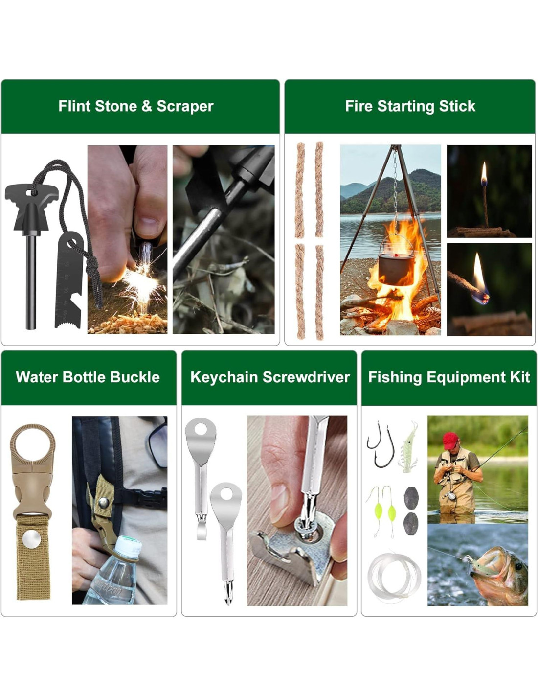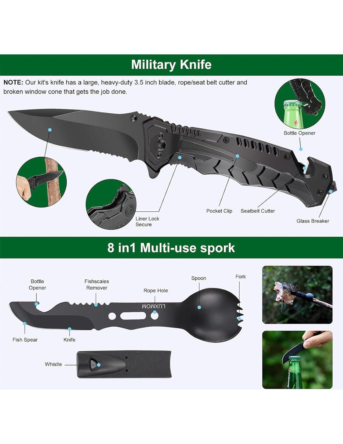 - [Un kit de supervivencia imprescindible] El kit de supervivencia LUXMOM es único en que fue diseñado específicamente por expertos en supervivencia. El kit de supervivencia integral no solo incluye 21 herramientas de supervivencia multipropósito, sino que también ofrece un kit de primeros auxilios de 106 piezas y un conjunto de herramientas de pesca que pueden satisfacer tus diferentes necesidades y proporcionar la protección más segura y completa para cualquier actividad al aire libre como camping, senderismo, viajes en automóvil, escalada, navegación, etc.