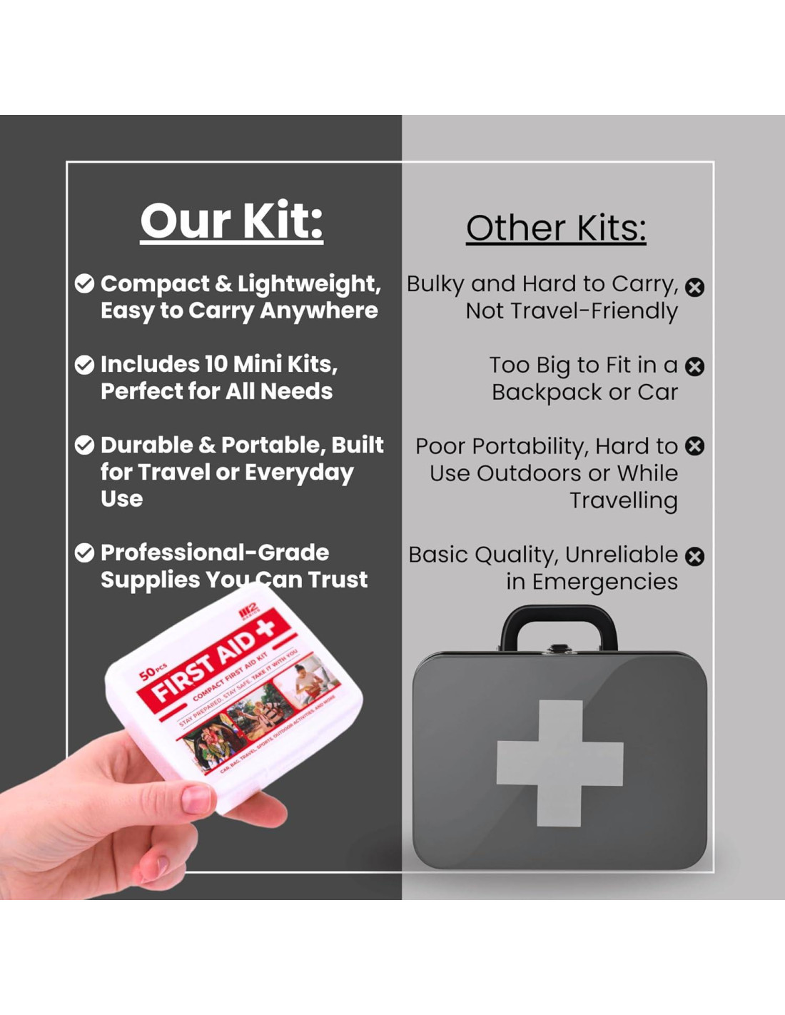 - Kits de Emergencia Compactos y Portátiles: Cada kit de primeros auxilios para vehículos y kit de primeros auxilios mini es ligero y fácil de almacenar, ofreciendo preparación confiable para la vida en movimiento.