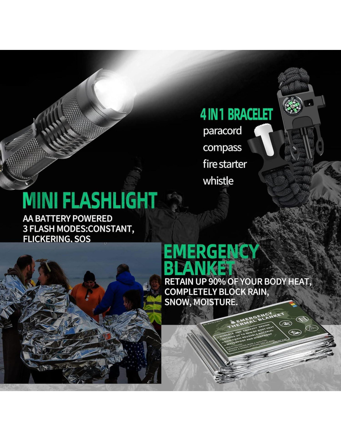 - Equipos de Camping Profesionales - Consigue lo que necesitas en camping y otras emergencias. Este kit incluye: pulsera multifuncional, encendedor, manta de emergencia, linterna (necesita batería AA), palo luminoso. Todos los artículos se pueden guardar en la bolsa mejorada.