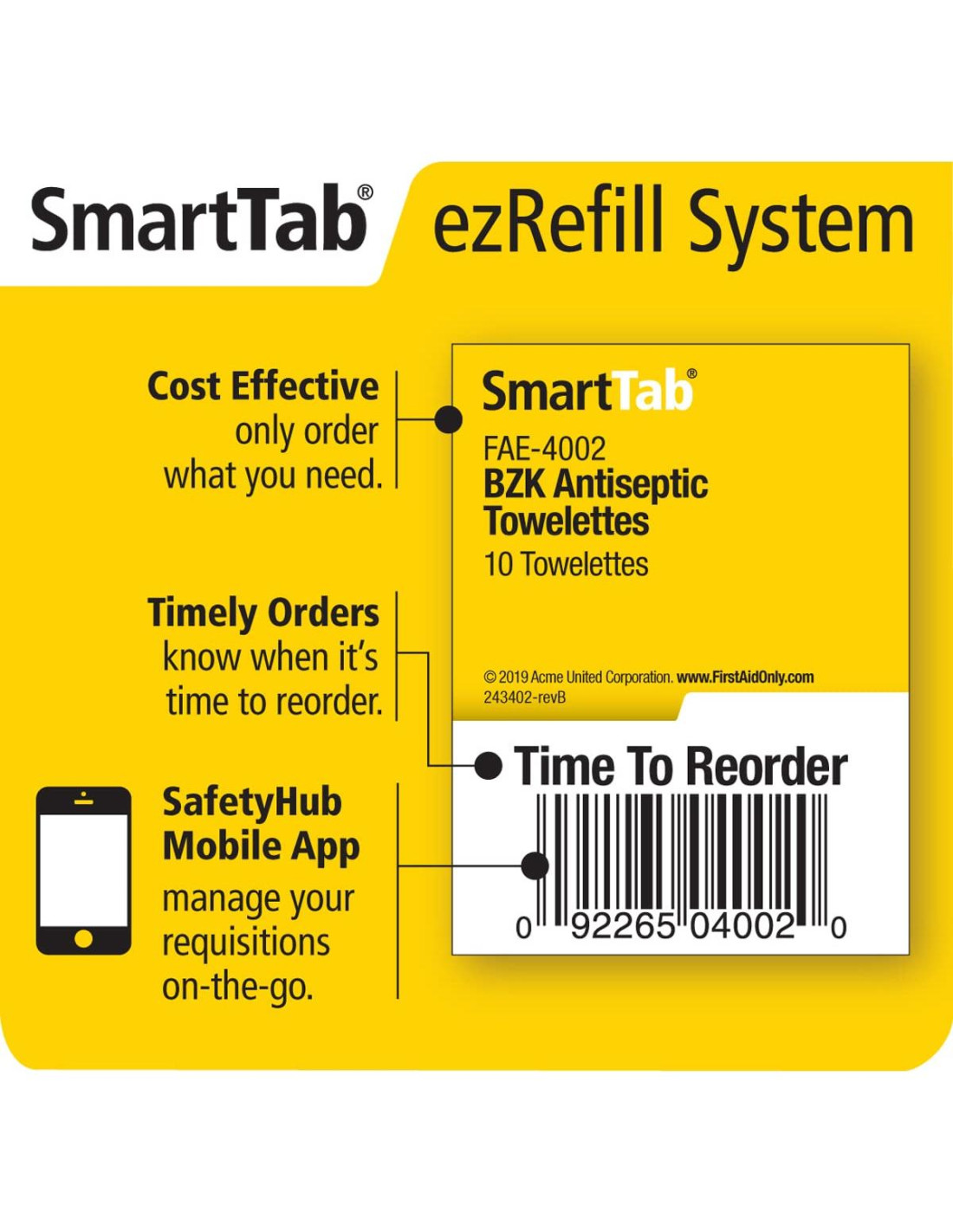 - Sistema SmartTab: Nuestro sistema SmartTab ezRefill hace que sea rápido, fácil y rentable encontrar, volver a pedir y reabastecer nuestros kits de primeros auxilios industriales con suministros de recarga de kits de primeros auxilios