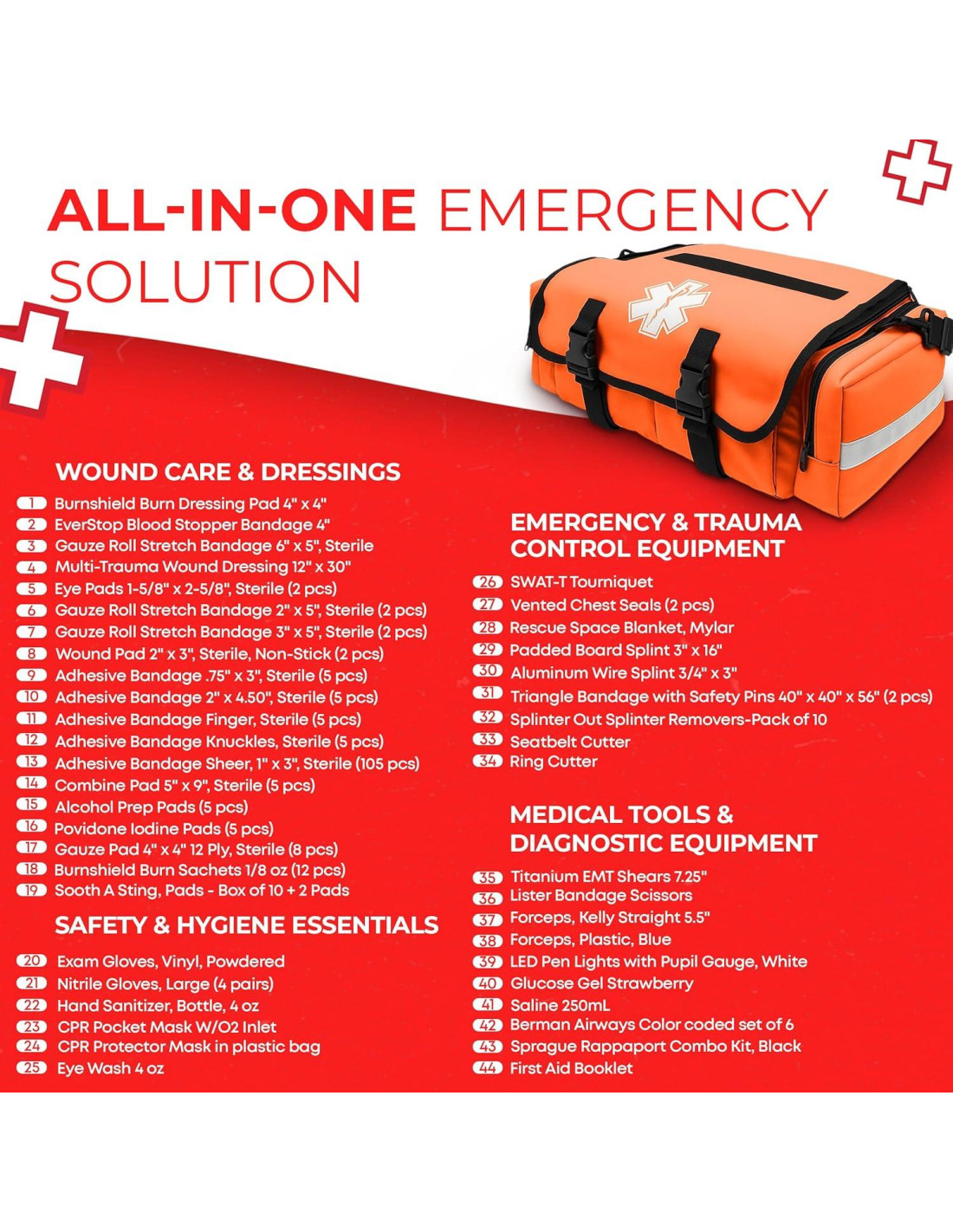 - KIT DE TRAUMA DE EMERGENCIA COMPLETAMENTE SURTIDO: Esta bolsa de trauma está prellenada con más de 174 suministros médicos críticos para apoyar a los primeros respondedores en escenarios de lesiones severas. Incluye vendajes de trauma, almohadillas de gasa, vendajes de compresión, toallitas antisépticas, escudo de RCP, guantes y materiales de inmovilización, todo organizado para un acceso rápido.