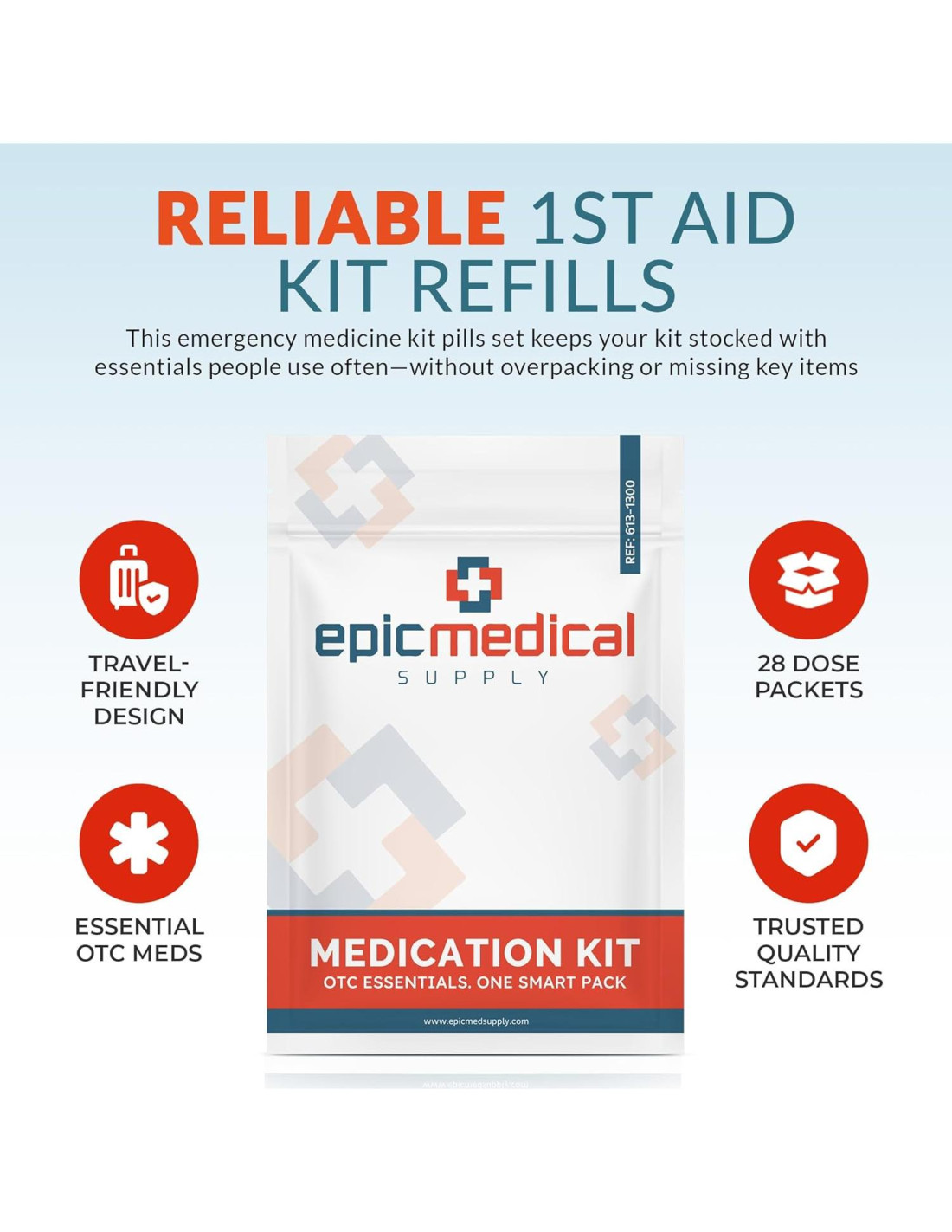 En Epic Medical Supply, creemos que la preparación debe ser simple. Nuestros kits de reabastecimiento de medicamentos están diseñados para ayudar a las personas a estar listas, en casa, en el trabajo o en movimiento. Sin complicaciones, solo lo esencial de venta libre que realmente usas, todo convenientemente empaquetado en fáciles paquetes de dosis para llevar. Orgullosamente ensamblado en EE. UU. Mantén algunos paquetes en tu bolso, cajón, guantera o maleta. Desde viajes largos hasta desplazamientos diarios, esta selección compacta de medicamentos es una solución inteligente para personas en movimiento. Ya sea que estés gestionando un gabinete médico de oficina o preparándote para una aventura, estos paquetes de reabastecimiento de medicamentos se integran perfectamente en tu configuración. Sin botellas, sin medir, solo agarra y ve. Compacto, confiable y listo cuando lo necesites. El kit de reabastecimiento de medicamentos de Epic Medical Supply está diseñado para personas reales en situaciones reales. Ya sea que estés reabasteciendo un kit médico en casa, viajando o preparándote para emergencias, este kit facilita estar listo.