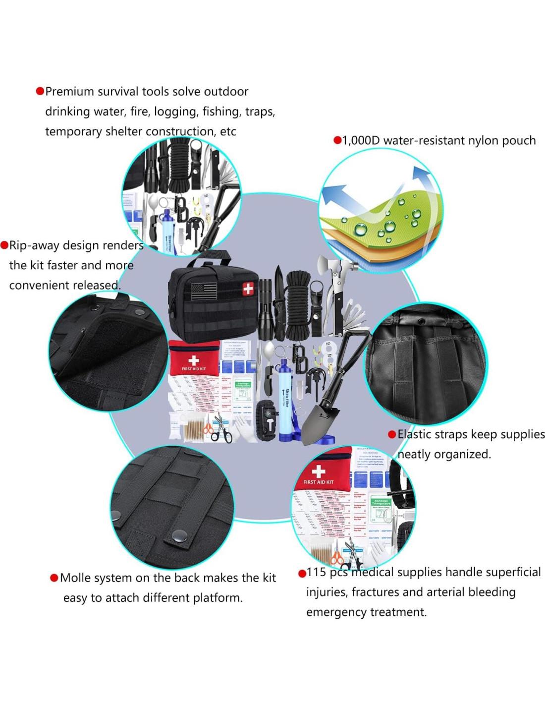 - Componentes incluidos: Suministros de primeros auxilios, sistema Molle, herramientas de supervivencia, juegos de pesca