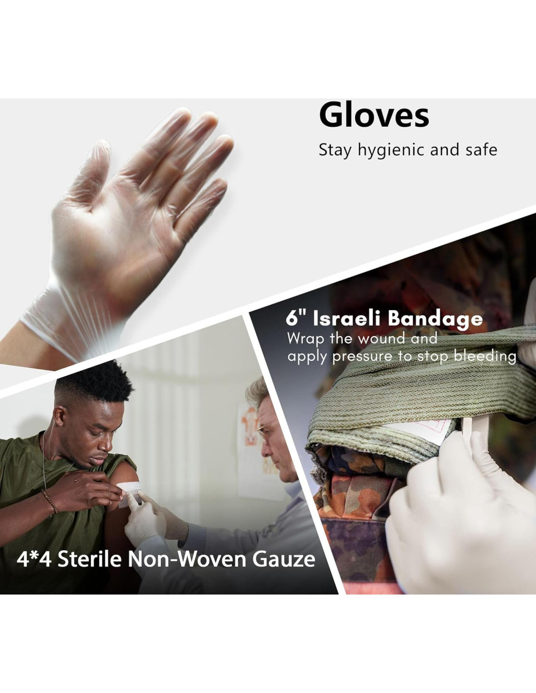 - CONTROL DE HEMORRAGIA: Nuestro kit incluye un vendaje israelí y una gasa comprimida, dispositivos probados para controlar eficazmente hemorragias masivas y potencialmente salvar vidas en situaciones críticas. La Gasa Estéril No Tejida 4*4 (10.16 cm x 10.16 cm) se puede usar para aplicar presión y absorber sangre de las heridas, ayudando en el control de hemorragias