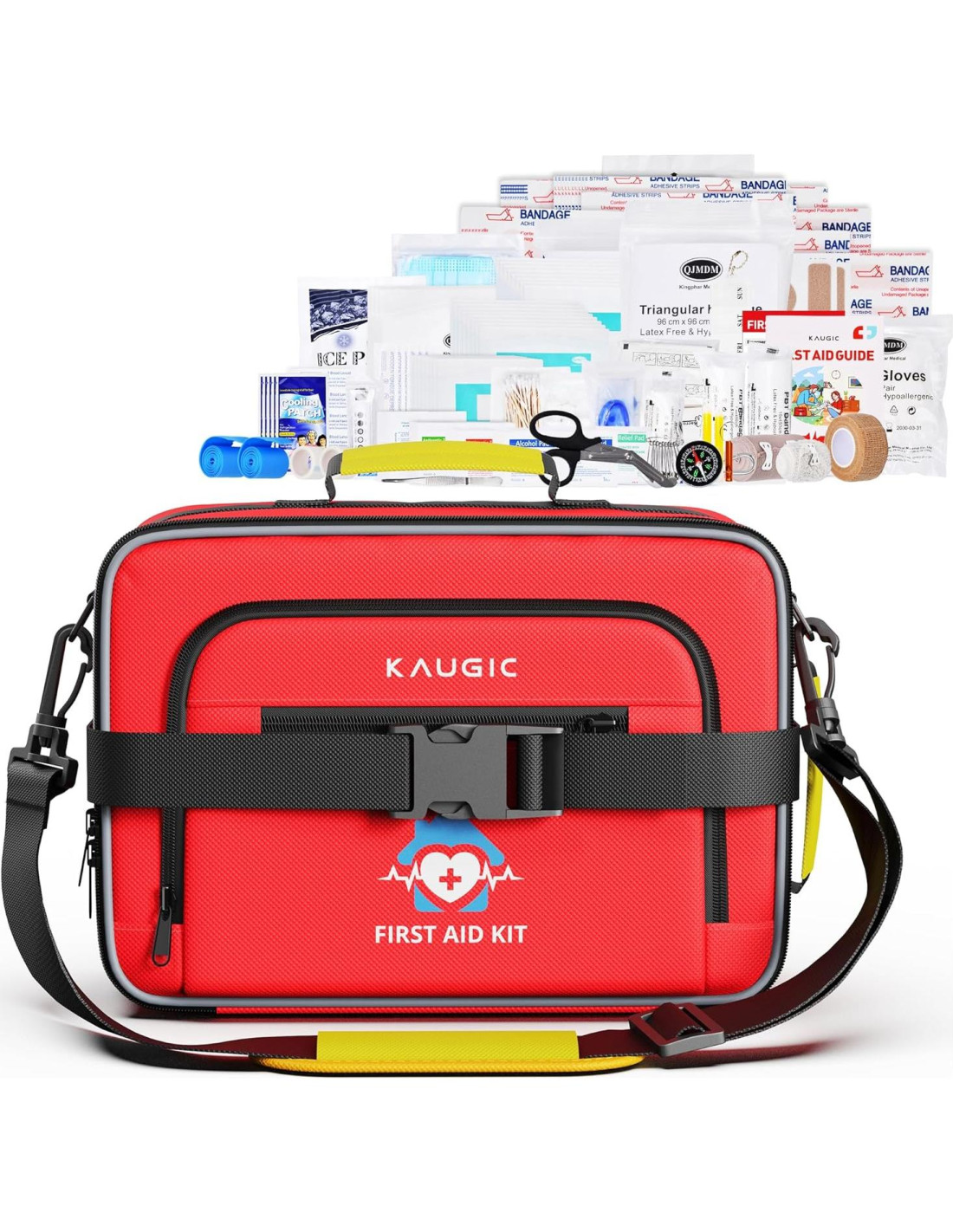 - Kit de Primeros Auxilios de Viaje Grande: El kit de primeros auxilios integral de KAUGIC incluye 500 piezas de suministros médicos esenciales, desde cuidado de heridas (gasa, vendajes, cierres) hasta herramientas de emergencia (escudo de RCP, torniquete, Guía de Primeros Auxilios) y equipo de supervivencia (brújula, manta de emergencia, palo luminoso), etc. Perfecto para viajes, camping, senderismo, montar, vehículos, aventuras al aire libre, hogar, negocios, oficina, residencia universitaria, etc. emergencias.