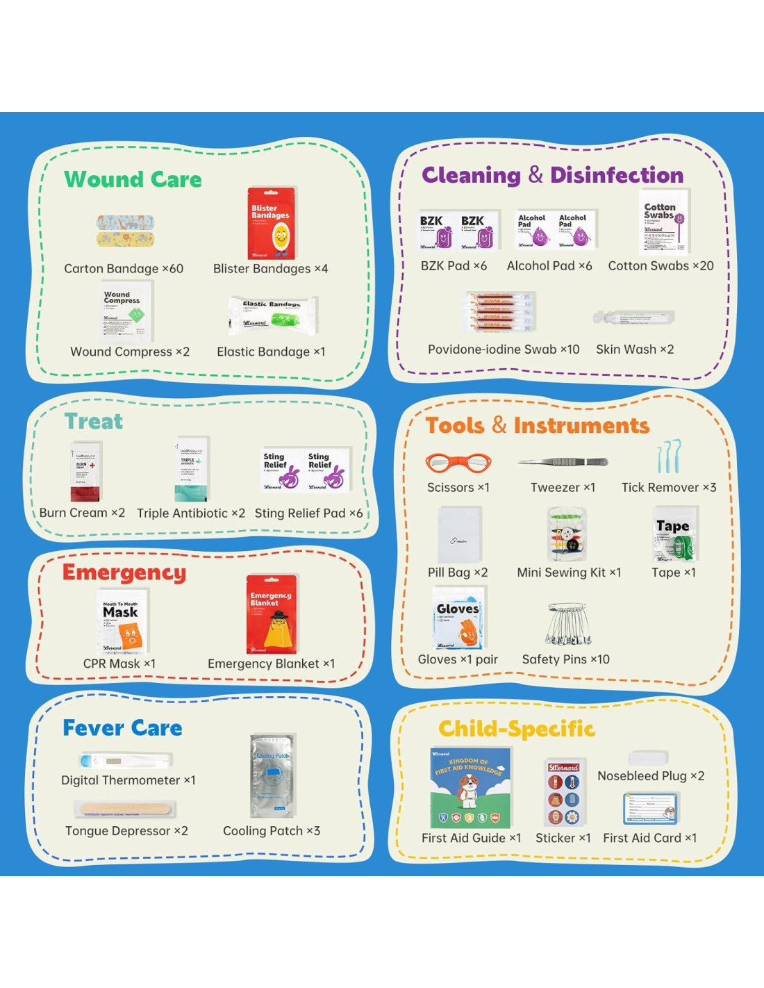 - 150+ PIEZAS EN UN KIT COMPLETO: Equipado con suministros esenciales de primeros auxilios para niños, incluyendo vendajes (caricatura, ampollas), cuidado de heridas (compresas), herramientas (tijeras, pinzas, termómetro), artículos de seguridad (máscara de RCP, guantes, manta) y tratamientos especializados (tapones para hemorragias nasales, removedores de garrapatas). Totalmente equipado para los accidentes comunes de la infancia.