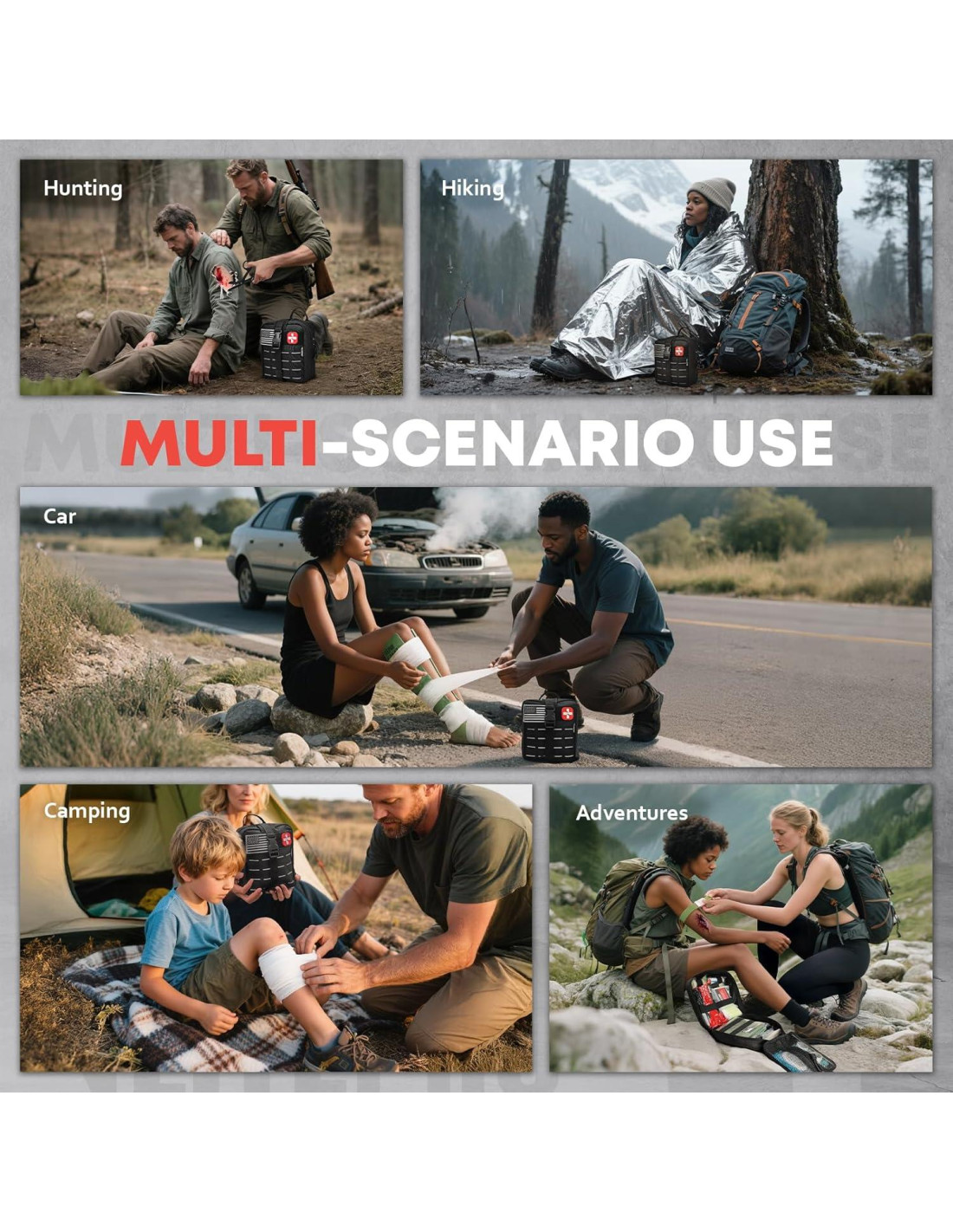 Ya sea que estés acampando, haciendo senderismo, explorando, viajando en coche, barco, bicicleta, motocicleta, en el trabajo, viajando, disparando, cazando, acampando, pescando, navegando, montando en bicicleta, deportes al aire libre, vida silvestre y otras aventuras al aire libre. ¡Nuestros kits de primeros auxilios te mantendrán a salvo!
