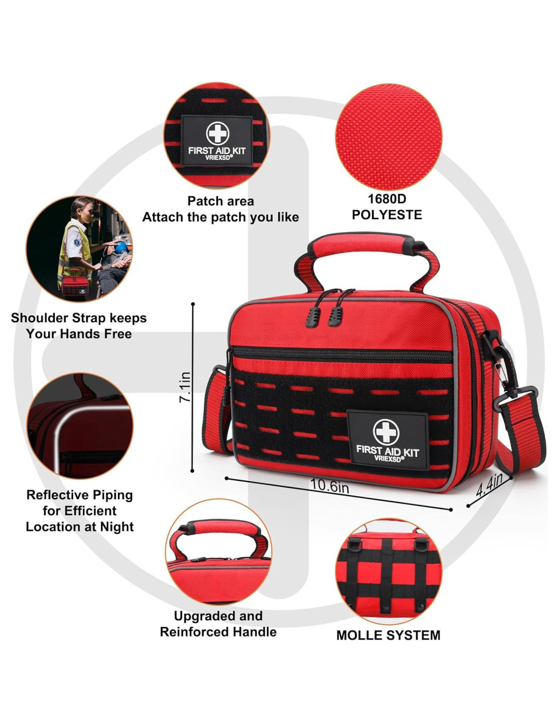 - BOLSA IMPERMEABLE Y DURADERA - El kit de primeros auxilios está hecho de fibra de poliéster 1680D que es resistente a desgarros e impermeable, y también tiene un sistema MOLLE que se puede usar con correas de hombro y hebillas de presión. También diseñado con asas en la parte superior y los lados, se puede montar en coches, camiones, etc., lo que lo hace conveniente de llevar. Equipado con tiras reflectantes que reflejan la luz en la oscuridad, es ideal para usar como un artículo de rescate de emergencia en condiciones adversas.