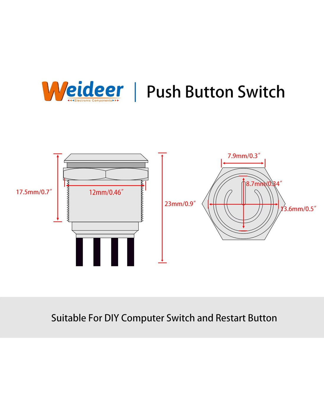 - Tamaño del interruptor: 13.5x16.8mm (0.5"x0.6"); Tamaño del agujero: 12mm (0.4"); Cable de extensión: 60cm (23.6")