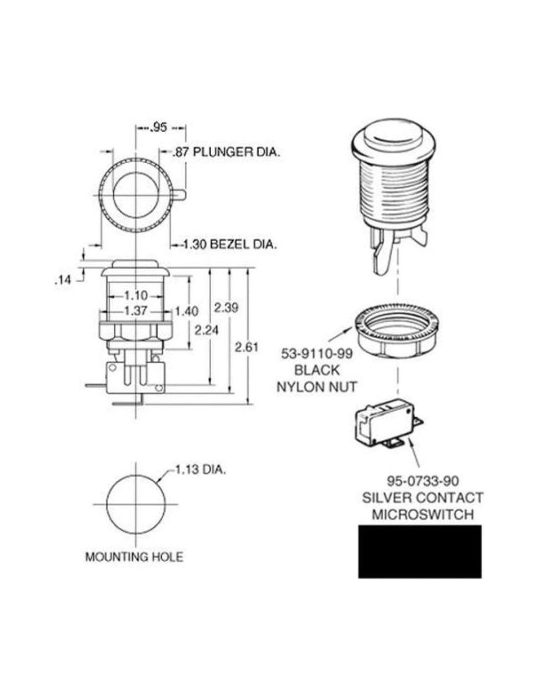 Cuenta con un pulsador cóncavo e incluye anillo de fijación y microswitch.