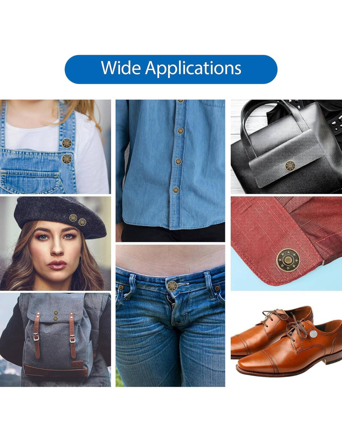 - Kit de Costura de Botones de Jeans: 8pcs tapas de botones, 8pcs remaches de hilo, 1 x destornillador. Diámetro: 17 mm (0.67 pulgadas). botones de reemplazo para jeans, adecuados para todo tipo de jeans en el mercado.
