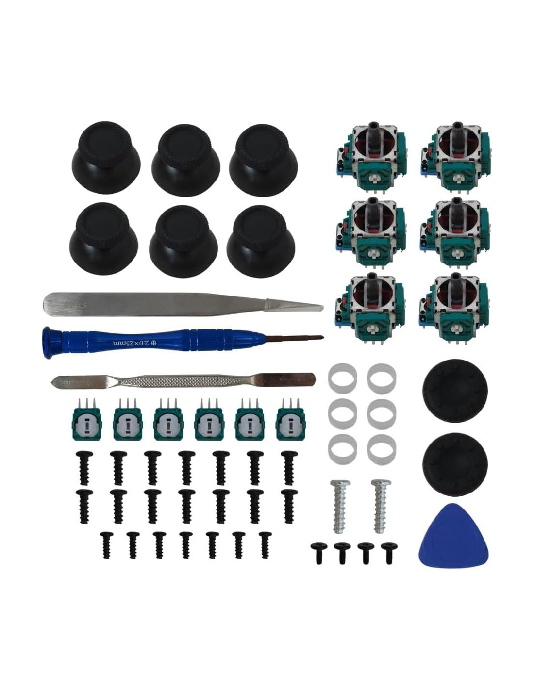 - Lo que obtienes -- El paquete incluye: 6 x Joystick, 6 x Potenciómetro de 2K3 Ohm, 6 x Tapa de Thumbstick, 6 x Anillo Protector, 2 x Agarre de Thumbstick, 27 x Tornillo, 1 x Destornillador de Cruz de Metal, 1 x Pinza de Metal, 1 x Herramienta de Palanca de Metal, 1 x Palanca de Palanca. (También necesitas una herramienta de soldadura que no está incluida en el kit.)