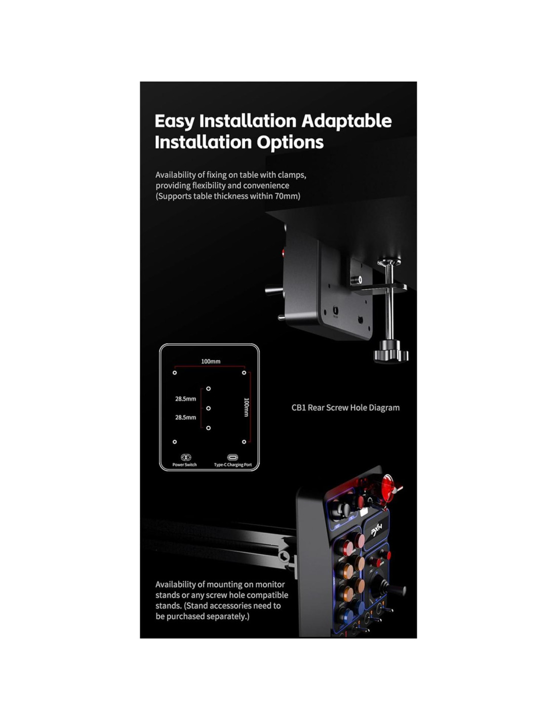 - 3. Fácil de instalar: PXN CB1 adopta un diseño de instalación simple y tiene configuraciones sencillas. El soporte de instalación de la caja de botones se puede conectar firmemente a tu mesa de juego o cualquier otra superficie, que puede acomodar hasta 7 cm de grosor. También se puede instalar en un monitor o en cualquier agujero de tornillo compatible, simplificando el proceso de instalación y permitiéndote entrar en la acción rápidamente.