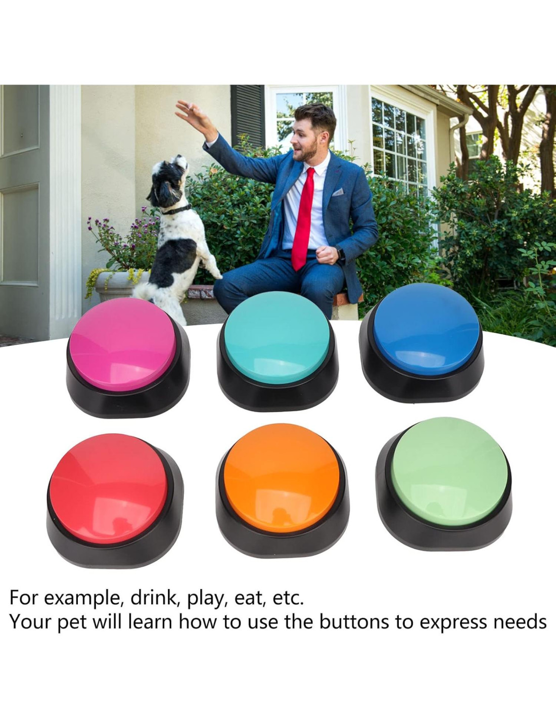 Los perros no pueden hablar, pero pueden mostrar cómo te aman fácilmente con el botón mágico, y fortalecer la relación entre tú y tus perros. 1. Toma la pata de tu perro y toca el botón, luego recompénsalo con un premio y después de unas cuantas veces entenderá lo que significa "comer". 2. Coloca un botón de "salir" en la puerta y presiónalo cada vez que salgas a pasear para ir al baño. 3. Recomendamos grabar uno o dos comandos al día, aumentando gradualmente la dificultad a medida que tu perro los aprende. Necesitarás ser paciente. Tipo de artículo: Botón de Grabación de Voz Material: ABS Cantidad: 6 piezas Color: Naranja, Rojo, Verde, Azul, Rosa, Azul Lago Tipo de batería: Requiere 2 x Baterías AAA x 6 (No Incluidas) Uso: Se utiliza para grabar sonido para promover la comunicación con las mascotas