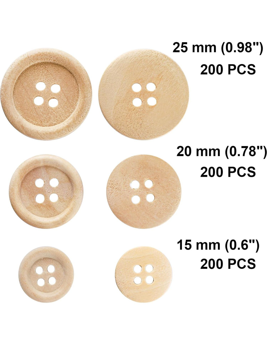 - Paquete a Granel de 600 Piezas Botones de Madera: El paquete incluye 200 piezas botones de 15 mm (0.6 pulgadas), 200 piezas botones de 20 mm (0.78 pulgadas), 200 piezas botones de 25 mm (0.98 pulgadas), total 600 piezas. 4 agujeros, cada agujero tiene aproximadamente 2 - 2.5 mm de diámetro, fácil de pasar el hilo a través
