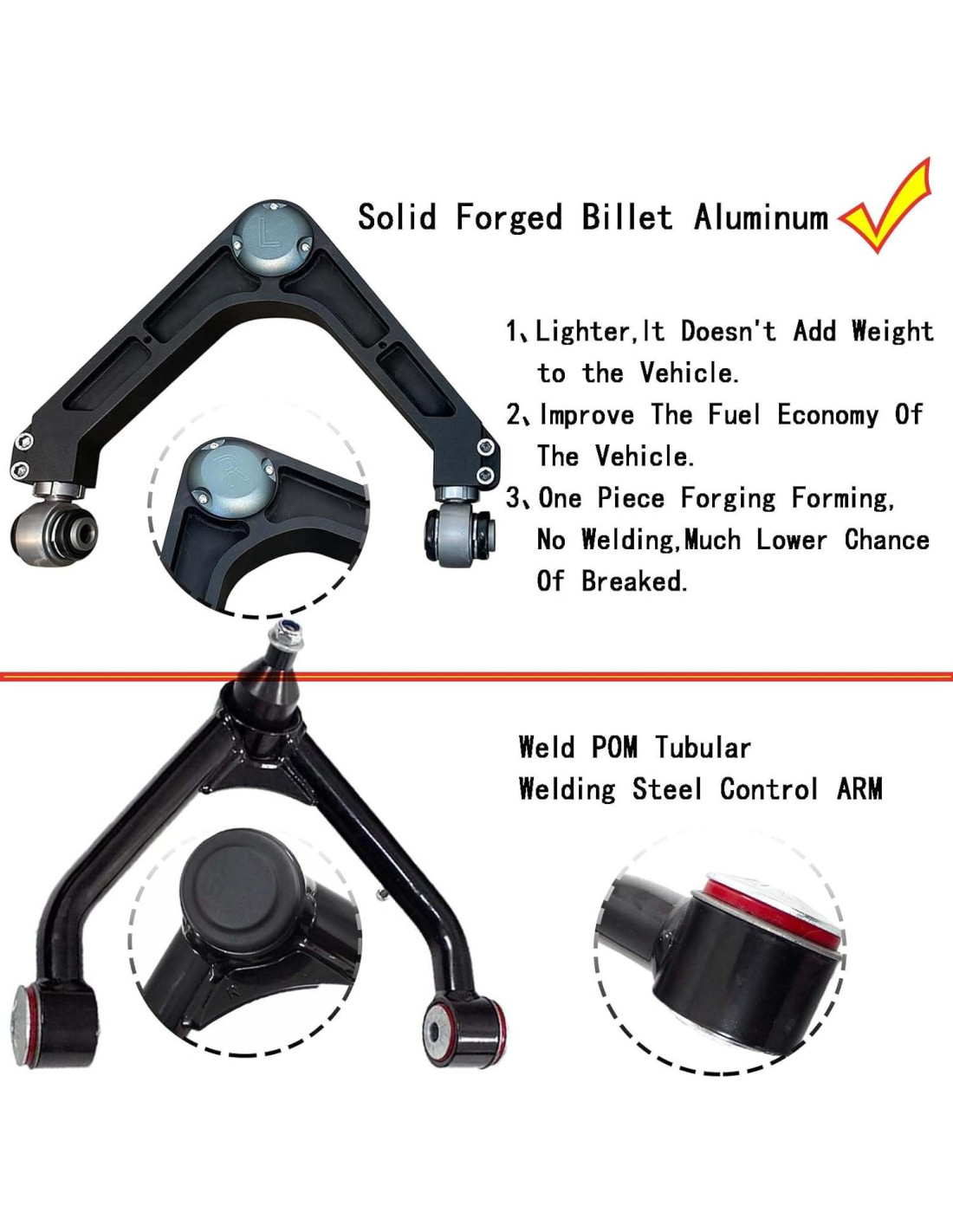 - [Paquete Incluye] : 2x Brazos de Control Superiores Delanteros (Izquierda + Derecha), Hardware Incluido.