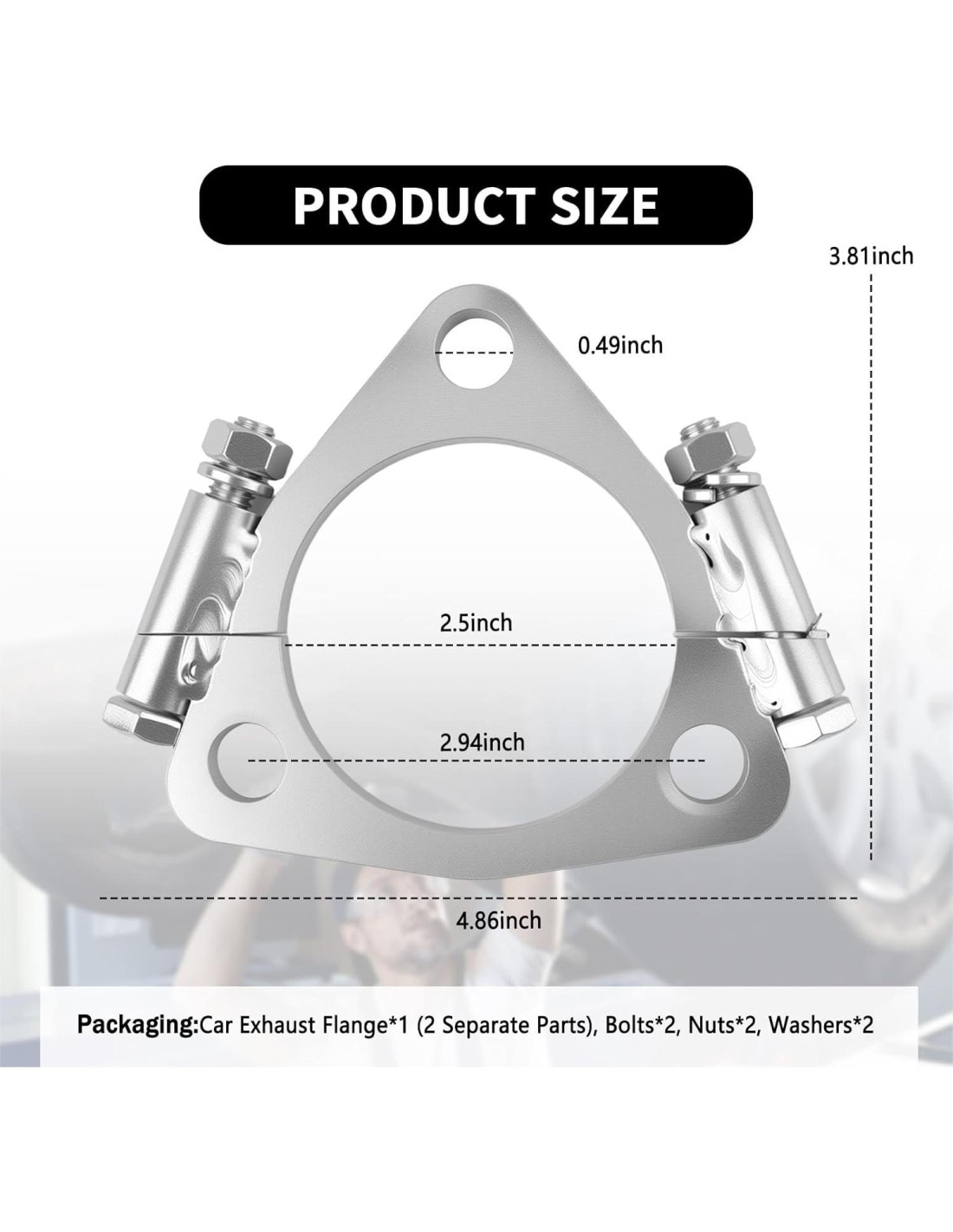 - Dimensiones Importantes: Nuestra brida de escape para automóviles es de estilo triangular, el diámetro interior es de 2.5 pulgadas (6.35 cm), la longitud total es de 4.86 pulgadas (12.34 cm), el ancho es de 3.81 pulgadas (9.66 cm), el diámetro del orificio para tornillo es de 0.49 pulgadas (1.24 cm), y la distancia entre los dos centros de los orificios para tornillo es de 2.94 pulgadas (7.47 cm)