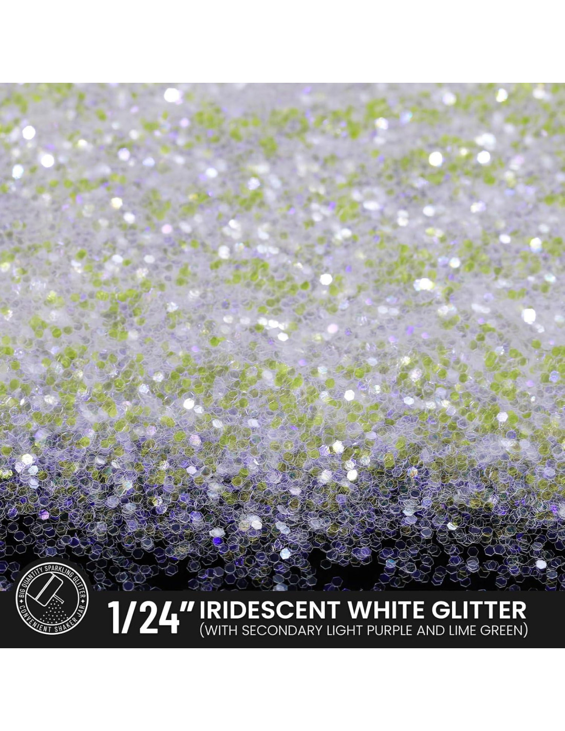 - Glitter Blanco Iridiscente Único de 1/24" (1 MM): Glitter blanco claro básico, desde diferentes ángulos, verás tonos soñadores de lavanda y amarillo lima, que aportan un sentido de misterio y gracia a tus piezas artísticas. Tamaño especial de 1/24" (1 mm), extra brillante bajo la luz, una elección de glitter maravillosa que no puedes perderte, solo pruébalo.