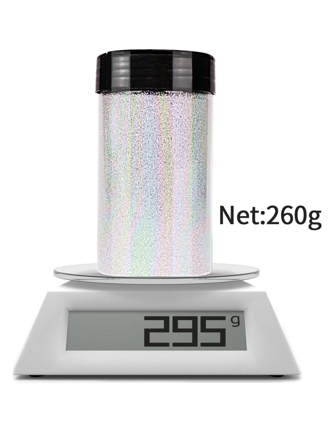- 1. Peso neto: aproximadamente 260g (9.17oz) por botella, generalmente, esta cantidad es suficiente para la mayoría de tus proyectos, y hay muchos colores para elegir, incluyendo 3 series, colores holográficos (láser), colores iridiscentes (arcoíris) y colores normales (metálicos).