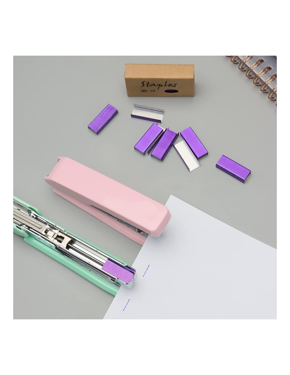 - [MATERIAL] -- Material metálico de alta calidad con recubrimiento morado, bastante fuerte para grampas de oficina, firme, duradero y anti-óxido, tacto suave y sensación de grapado suave;