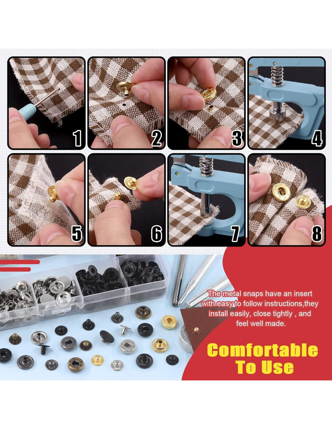 - [Fácil de usar] Un alicate para broches con punzón, destornillador, cabezales de repuesto también están incluidos en el paquete, lo que puede ayudarte a instalar los broches rápidamente sin gastar mucho esfuerzo. Primero, solo necesitas hacer un pequeño agujero con el punzón en el lugar donde deseas instalar, y luego poner el botón a través del agujero y la tapa en la parte superior, presionarlos con los alicates. Repite el mismo procedimiento para el otro lado. Trabajo terminado.