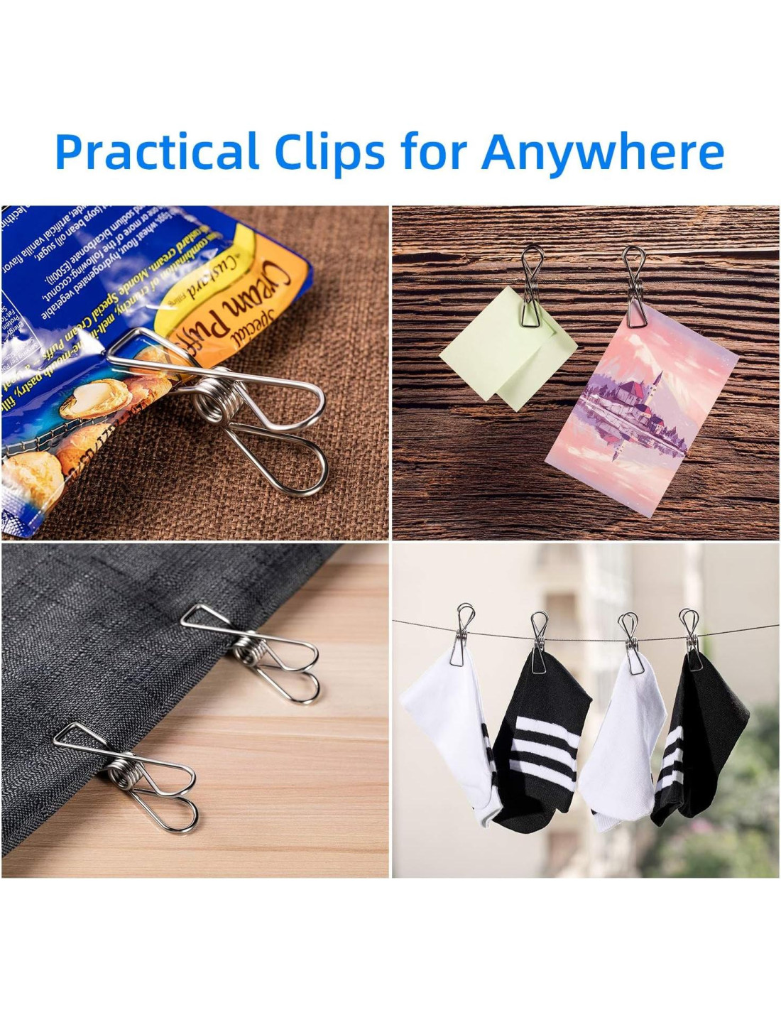 - [ Multiusos]: Nuestras pinzas de metal se pueden usar para una cuerda de ropa al aire libre, manualidades, lavandería, sellado de bolsas de bocadillos, decoración de habitaciones, cocina, industrial, colgador de fotos, hogar y cocina, almacenamiento en el congelador de alimentos, bolsa de bocadillos, clips de archivos de papel, y son fáciles de llevar cuando viajas.